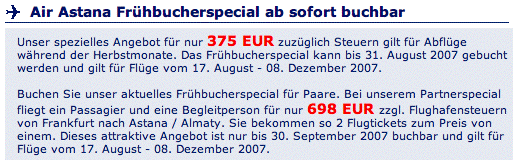375 Euro (bzw 698 Euro für 2 Personen) zuzüglich Steuern (von Frankfurt nach Astana/Almaty) scheint mir nicht zu teuer zu sein.