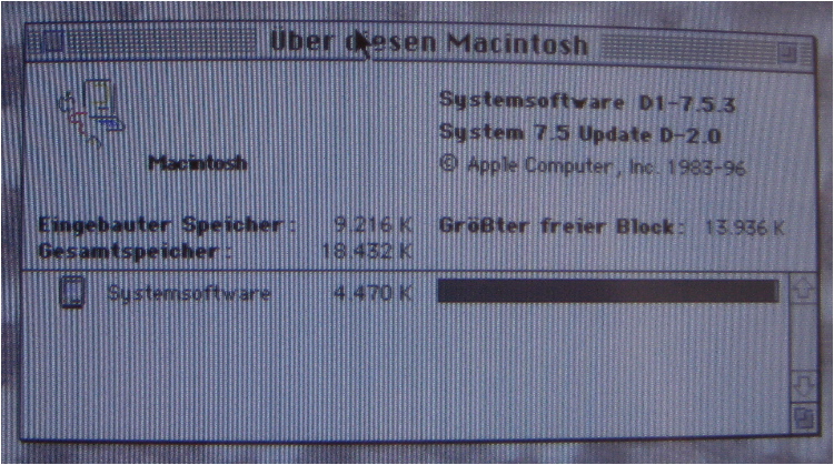 Meine Eltern räumen auf. Deswegen muss jetzt auch mein (alter) Mac II si (System 7.5.3, 9 MB Hauptspeicher, 80 MB Festplatte) weg, der die letzten Jahre eigentlich nur noch in der Ecke stand. Heute also mal dagewesen und gekuckt, ob noch was auf der Platte drauf ist. Ohne Probleme hochgefahren und sogar die aktuelle Uhrzeit angezeigt.