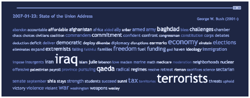 Zur Erklärung: 2 Leute haben sich die Arbeit gemacht und 365 Ansprachen der bisherigen US-Präsidenten analysiert und – ganz modern – in einer Tagcloud dargestellt. Über einen Schieberegler bewegt man sich auf einer Zeitachse und kann die Reden und Ansprachen auswählen.