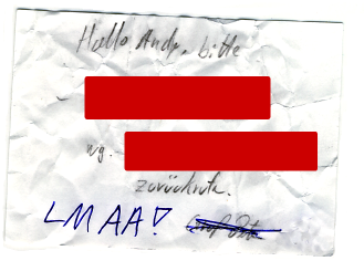 Das mit Kugelschreiber Geschriebene kam erst in Zettel 2.0 dazu, nachdem ich die Annahme von Zettel 1.0 mit der Begründung “dafür hab ich jetzt wirklich keine Zeit” und der Frage “wieviele Leute will der Kollege denn noch beschäftigen” verweigert hatte. Zumal er mitbekommen hat, dass ich schon gesehen hatte, wer da grade 20mal mein Telefon hat klingeln lassen.